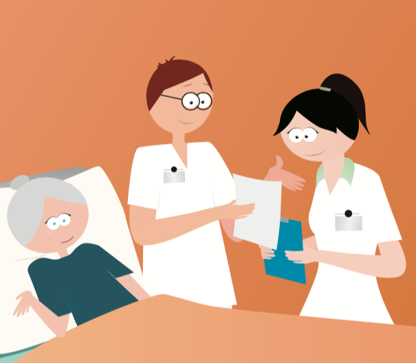 De verpleegkundige legt uit waarom de patiënt op de dienst is opgenomen en wat de laatste veranderingen in de verzorging zijn.