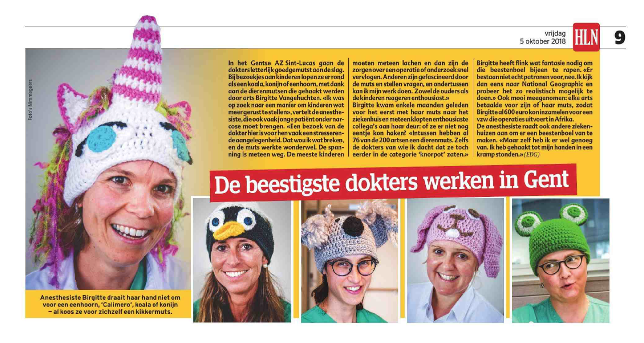 Kinderen die bij de dokter komen, zijn vaak angstig voor het onderzoek, de behandeling, een prik … Anesthesist Dr. Birgitte Vangehuchten, die vaak kinderen onder narcose brengt, ging op zoek naar een manier om hen af te leiden en aan het lachen te brengen. Ze experimenteerde met een zelfgehaakte dierenmuts in de vorm van een varken. En het was meteen een schot in de roos: ze waren gefascineerd, stelden vragen, moesten lachen … en ondertussen kon de arts haar werk doen. Ook ouders en personeel waren enthousiast.