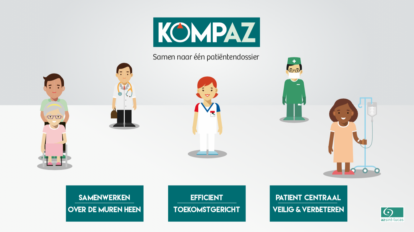 Het implementeren van een geïntegreerd elektronisch patiëntendossier (EPD) is één van de topprioriteiten in het strategisch plan van AZ Sint-Lucas: het vormt immers een fundament voor het leveren van veilige en kwalitatieve zorg. De keuze viel op de Millenniumoplossing van de Amerikaanse firma Cerner. Om de implementatie in goede banen te leiden, werd het project KompAZ gestart. Bij aanvang werden zes basisprincipes geformuleerd die het belang van het EPD duiden: samenwerken, over de muren heen, toekomstgericht, efficiënt, patiënt centraal en veilig & verbeteren.